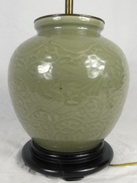 9 - CHINESE CELADON GLAZED PORCELAIN JAR LAMP Chinese Celadon glazed porcelain jar mounted as a lamp. Dragon motif to body. Jar measures 9" height x 8 1/4" diameter. Lamp measures 21 1/4" overall height.