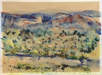 11 - JOHN MARIN MODERINIST WATERCOLOR 1917 John Marin (American, 1870-1953) watercolor on paper depicting an abstract landscape with houses and mountains. Pencil signed lower right and dated 1917. Measures 30" width x 22" height.