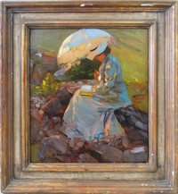 12 - MAX LIEBERMANN 'MARTHA' OIL PAINTING ON BOARD Max Liebermann (German, 1847-1935) oil painting on board depicting the artist's wife, Martha, reading a book while holding an umbrella. Signed lower left. Measures 15 1/4" x 13 1/4" + 3" frame.