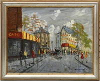 13 - CONSTANTIN KOROVINE OIL PAINTING ON BOARD Konstantin Alexievitch Korovine (Russian/French, 1861-1939) oil painting on board depicting a Parisian street scene. Signed lower right. Measures 13 1/2" x 10 5/8" + 1" frame.