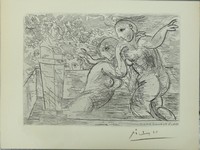 14 - PABLO PICASSO 'LES BAIGNEUSES SURPRISES' LITHO Pablo Picasso lithograph titled 'Les Baigneuses Surprises'. Hand signed lower right. Includes certificate of authenticity. Measures 11" x 8 1/4".