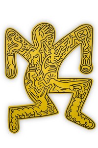 16 - KEITH HARING CARVED & PAINTED WOOD SCULPTURE Keith Haring (American, 1958-1990) carved and painted wood sculpture of a figure. Black painting over a yellow ground. Signed and dated 1989 to verso. Marked Tony Shafrazi Gallery, New York. Measures 44 1/4" height x 36" width.