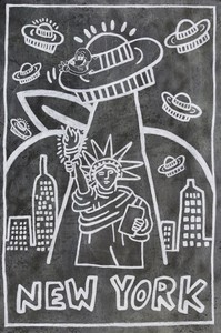 17 - KEITH HARING NEW YORK SUBWAY SERIES CHALK DRAWING Chalk drawing on black paper depicting a flying saucer "beaming up" the Statue of Liberty. Six additional flying saucers above The Big Apple and various buildings. Inscribed 'New York'. Measures 39" height x 27" width.