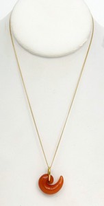 19 - ANGELA CUMMINGS TIFFANY JASPER 18kt YG NECKLACE Angela Cummings for Tiffany & Company 18kt yellow gold necklace with swooping orange jasper pendant suspended by an 18kt yellow gold ring. Marked Tiffany & Co, 18K to ring and clasp of necklace. Jasper pendant measures 22mm. Gold hoop measures 14mm. Necklace measures 16" length.