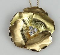 1 - TIFFANY & CO 18kt YELLOW GOLD & DIAMOND NECKLACE Tiffany & Company 18kt yellow gold and diamond pansy pendant with Tiffany & Company 14kt yellow gold necklace. Pendant having three diamonds marked Tiffany & Co, France, 18kt, measures 1 3/8" width. Chain marked Tiffany & Co, 585 measures 18" length.