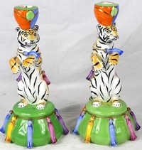 21 - PR LYNN CHASE 'TIGER RAJ' PORCELAIN CANDLESTICKS Pair of Lynn Chase porcelain candle holders in the 'Tiger Raj' pattern. Each marked to underside and measures 11" height.