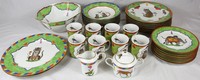 22 - LYNN CHASE 'TIGER RAJ' SERVICE FOR 8 + SERVING PCS 37 pieces of Lynn Chase porcelain China set in the 'Tiger Raj' pattern. Includes 8 dinner plates-10 7/8", 8 salad/dessert plates-8 1/4", 8 large rim soup bowls-9 1/8", 8 coffee mugs-3 5/8", 2 service plate chargers-12", 1 octagonal vegetable bowl-10 1/4", 1 covered sugar-6 1/4" and 1 creamer-4 3/4". Each marked to underside.