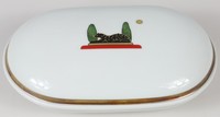 23 - CARTIER 'LA MAISON DE CARTIER' PORCELAIN BOX Cartier Limoges oval covered porcelain box in the 'La Maison De Cartier' pattern. Black panther decoration to cover. Marked to underside. Measures 6 3/4" length. Includes certificate of authenticity.