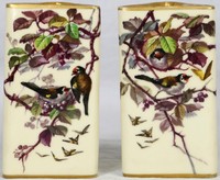 24 - PR ENGLISH TRIANGULAR PORCELAIN VASES w BIRDS Pair of English porcelain vases of triangular form. Each decorated with birds and foliage. Each marked to underside and measures 5 5/8" height.