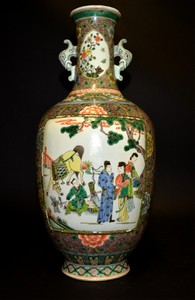 25 - CHINESE FAMILLE VERTE PORCELAIN TWIN EAR VASE Chinese Famille Verte vase with double handles in the form of stylized elephant heads. Body decorated with two large panels having figural courtyard scenes and elaborate floral decoration throughout. Measures 17 1/2" height.