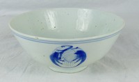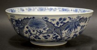 26 - CHINESE LARGE BLUE & WHITE PORCELAIN DRAGON BOWL Chinese large blue and white porcelain bowl. Exterior decorated with dragon motif. Interior decorated with foliage and bird. Marked to underside. Measures 10 1/2" diameter.