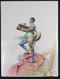 28 - HAND PAINTED PORCELAIN PLAQUE SIGNED Hand painted porcelain plaque depicting a man with mandolin. Signed in cyrillic lower right. Measures 13 3/4" x 10 3/8".