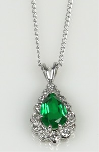 2 - 1ct PEAR SHAPED EMERALD 14kt WG & DIAMOND NECKLACE 14kt white gold necklace having a pendant with approx 1ct pear shaped emerald surrounded by 14 diamonds, approx 0.1ctw. Marked 14K to pendant and clasp of chain. Necklace measures 18". Pendant measures 20mm length including bail.