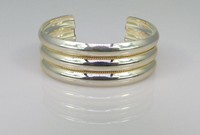 30 - TIFFANY STERLING SILVER & 14kt YG RIBBED CUFF Tiffany & Company sterling silver cuff bracelet having ribbed decoration with 14kt yellow gold twisted accents. Marked Tiffany & Co, 925, 585. Measures 2 1/2" width. Total weight 50.2g.