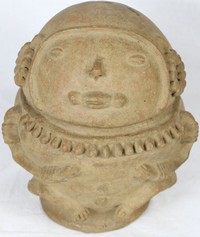 31 - PRE-COLUMBIAN POTTERY FIGURAL VESSEL Pre Columbian pottery funerary covered vessel in the form of a figure with earrings and necklace. Measures 10 1/4" height x 8 1/2" width.