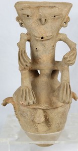 32 - PRE-COLUMBIAN POTTERY FIGURAL VESSEL w STAND Pre Columbian pottery funerary covered vessel. Seated figure to lid. Lower part of vessel having four handles and rounded bottom. Includes lucite base. Measures 15 1/2" overall height. Base measures 8" square.