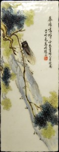 33 - CHINESE HAND PAINTED PORCELAIN PLAQUE w INSECT Chinese hand painted porcelain plaque decorated with an winged insect on branch. Signed and holds calligraphy along right edge. Measures 8" x 3".
