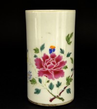 34 - CHINESE FAMILLE ROSE PORCELAIN BRUSH POT Chinese Famille Rose porcelain brush pot of cylindrical form. Decorated with florals and foliates. Measures 6 3/4" height x 3 1/4" diameter.