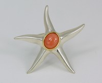 35 - TIFFANY STERLING & 18kt YG CORAL STARFISH BROOCH Tiffany & Co sterling vintage silver brooch with coral cabochon to center mounted in an 18kt yellow gold bezel. Marked to backside Tiffany & Co, 925, 750.. Measures 2 1/8" (5.4cm) width.