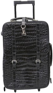 37 - ROBERTO CELK ARTIOLI CROCODILE CARRY-ON SUITCASE Roberto Celk & Artioli black crocodile carry-on suitcase. Having textured crocodile leather, retractable handle, side and top handles, wheels protective plastic feet on the bottom, silver toned hardware and luggage tag. Measures 23" height x 14" width x 8 1/2" depth.