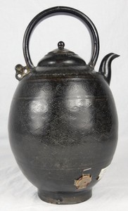 42 - CHINESE SONG DYNASTY BLACK GLAZED POT w WAX SEAL Chinese Song Dynasty black glazed water pitcher with handle, lid and spout. Holds wax seal and Chinese label to side. Measures 11 3/4" height.