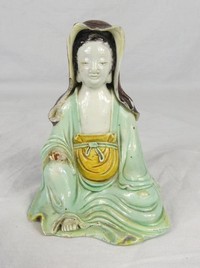 44 - CHINESE PORCELAIN QUAN YIN w CHING TSAI LOO LABEL Chinese porcelain figure of seated Guan Yin in celadon robe. Holds C.T. Loo & Cie label to underside. Measures 4 1/2" height. Condition: Chips and losses present. Please review photos and request condtion report.