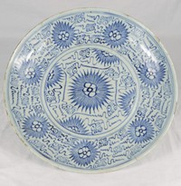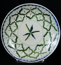 45 - CHINESE BLUE & GREEN PORCELAIN DISH 19th century Chinese porcelain dish with blue and green decoration. Stylized six-point flower in the center surrounded by a lattice border Measures 8" diameter.