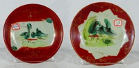 48 - PR CHINESE IRON RED PORCELAIN DISHES 2 Chinese Iron Red porcelain dishes. Each decorated with landscape scene to center. Each marked to underside and holds wax seal. Each measures 5 7/8" diameter.