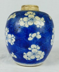 49 - CHINESE BLUE & WHITE 'PLUM FLOWER' PORCELAIN JAR Chinese blue and white porcelain jar with plum flower decoration. Measures 4 3/4" height.