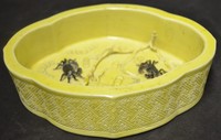 5 - CHINESE YELLOW GLAZED CRAB BRUSH WASHER SOTHEBYS 19th century Chinese yellow glazed porcelain brush washer of begonia-form. Having carved crab motif to interior. Incised geometric design to exterior. Measures 5 5/8" length x 4 1/8" height x 1 3/8" height. Provenance: Purchased at Sotheby's, New York.