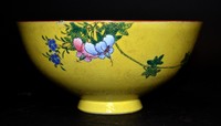 6 - CHINESE FAMILLE ROSE YELLOW GROUND PORCELAIN BOWL Chinese Famille Rose porcelain bowl decorated with enameled floral branches over a bright and thick yellow ground. Marked to underside. Measures 6 3/4" diameter.