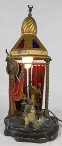 9 - FRANZ BERGMAN VIENNA BRONZE TENT LAMP Franz Bergmann (Austrian, 1861-1936) cold-painted polychrome bronze lamp depicting two Arabs in a tent. Holds Bergman B urn and marked Austria. Measures 10" height.