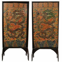 13 - PR BHUTAN TEMPLE DOORS w DRAGONS Pair of Bhutan wooden temple doors painted with dragons, waves and clouds. One panel measures 67" height x 36 1/2" width. Second panel measures 67" height x 35" width. Each framed stand measures 88" height x 39 1/2" width.