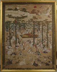 14 - 18th C JAPANESE NIRVANA OF BUDDHA SCROLL PAINTING Late 17th to early 18th century Japanese scroll painting on rice paper centrally depicting the deceased Buddha wearing polychromatic painted draped garb, resting on a altar surrounded by mourning figures with an array of naturalistically painted animals in the lower section. The sky stylistically painted with clouds and immortals viewing the scene below.. All painted on a beige ground bordered in golden brown silk and mounted in a gilt wood frame. Signed lower right. Painting measures 79 1/2" x 59 1/2" + 6" mat & frame.