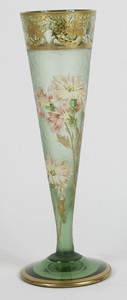 18 - MONT JOY ENAMELED & GILT CAMEO GLASS VASE Mont Joy enameled cameo art glass vase of trumpet form. Floral decoration to body and gold gilt embellishment throughout. Marked to underside. Measures 11 1/2" height.