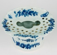 22 - DR. WALL WORCESTER RETICULATED PORCELAIN BASKET Dr. Wall Period Worcester blue and white porcelain basket having applied handles, flowers and leaves. Crescent mark to underside. Measures 10 3/4" length.