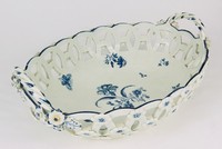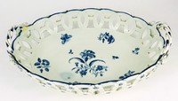 46 - DR. WALL WORCESTER RETICULATED PORCELAIN BASKET Dr. Wall Period Worcester blue and white porcelain basket having applied handles, flowers and leaves. Crescent mark to underside. Measures 11" length.