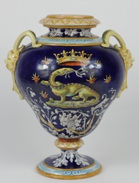 23 - ULYSSE BLOIS BALON FAIENCE POTTERY URN Ulysse Blois faience pottery handled urn by Emile Bruneau Balon (1859-1929). Depicts a dragon-like beast below crown with griffin to opposing side. Marked to underside. Measures 11" height x 8 3/4" width.