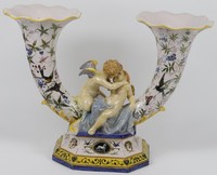 24 - FAIENCE POTTERY DOUBLE VASE w CHERUBS Faience pottery double vase featuring two embracing cherubs. Decorated with foliage and insects. Signed to underside. Measures 17 3/4" length x 13" height.