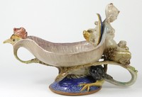 25 - GINORI MAJOLICA MYTHICAL BEAST GRAVY BOAT Ginori Majolica pitcher or gravy boat having a nude female centaur seated on mythical beast handle and having a rooster-form spout. Marked to underside and inscribed with L. Measures 13" length.