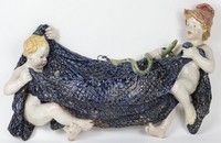 27 - GINORI MAJOLICA WALL POCKET w PUTTI Ginori Majolica wall pocket depicting two putti holding net with serpent and fish. Signed Ginori and numbered 353. Measures 18" width x 13" height.