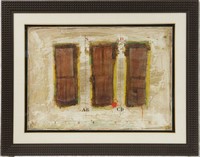 2 - JAMES COIGNARD OIL PAINTING ON PAPER James Coignard (1925 - 2008) abstract oil painting on paper. Depicts three reddish vertical lines. Measures 40" x 28 1/2" + 7" mat & frame.