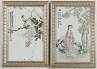 31 - PR CHINESE FAMILLE ROSE PORCELAIN PLAQUES Pair of Chinese Famille Rose porcelain plaques. One depicts a maiden standing beside trees. The other depicts a bird perched on floral branches. Each signed and holds calligraphy upper left. Measures 7 1/2" x 4 1/2" + 3/4" frame.