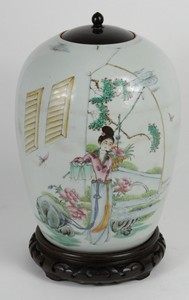 33 - CHINESE FAMILLE ROSE PORCELAIN GINGER JAR Chinese Famille Rose porcelain ginger jar. Depicts a maiden in a courtyard scene. Holds calligraphy to verso. Marked to underside. Porcelain measures 11" height. Measures 13 1/4" overall height with wooden cover and base.