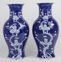 34 - PR CHINESE BLUE & WHITE PORCELAIN BLOSSOM VASES Pair of Chinese blue and white porcelain vases. Each decorated with plum blossoms. Each holds double concentric circle mark to underside and measures 13 1/2" height.