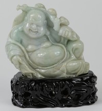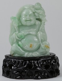 37 - CHINESE CARVED JADE SEATED BUDDHA Chinese jadeite carving depicting a seated Hotei Buddha. Measures 5" width x 4" height + 1 7/8" wooden base. Jade weight 1107g.