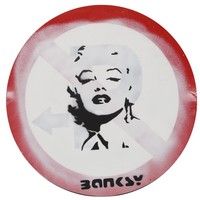 3 - BANKSY 'MARILYN' STREET SIGN Spray paint on British metal street sign in the manner of Banksy. Tagged Banksy along lower edge. Measures 23 3/4" diameter.