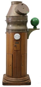42 - J.W. RAY & LIVERPOOL LARGE BRASS SHIP TELEGRAPH J.W. Ray & Co, Liverpool & London large brass ship's telegraph. Measures 52" height including handle. Dial measures 16 1/4" diameter.
