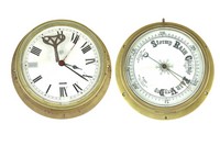 44 - 2pc BRASS CASED SHIPS CLOCK & BAROMETER Set of two brass cased ship's clock and aneroid barometer. Each measures 10 1/2" diameter.