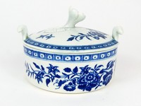 45 - DR. WALL WORCESTER PORCELAIN BUTTER BOAT Dr. Wall period Worcester blue and white porcelain butter dish with applied flower-form handle to cover. Crescent mark to underside. Measures 4 3/4" width at handles x 4 3/8" diameter.